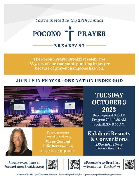 | Oct. 3 - Tuesday 6:15AM - 9:00AM | 28th Annual Pocono Prayer Breakfast  https://poconoprayerbreakfast.org/ [here] Poster [click] |